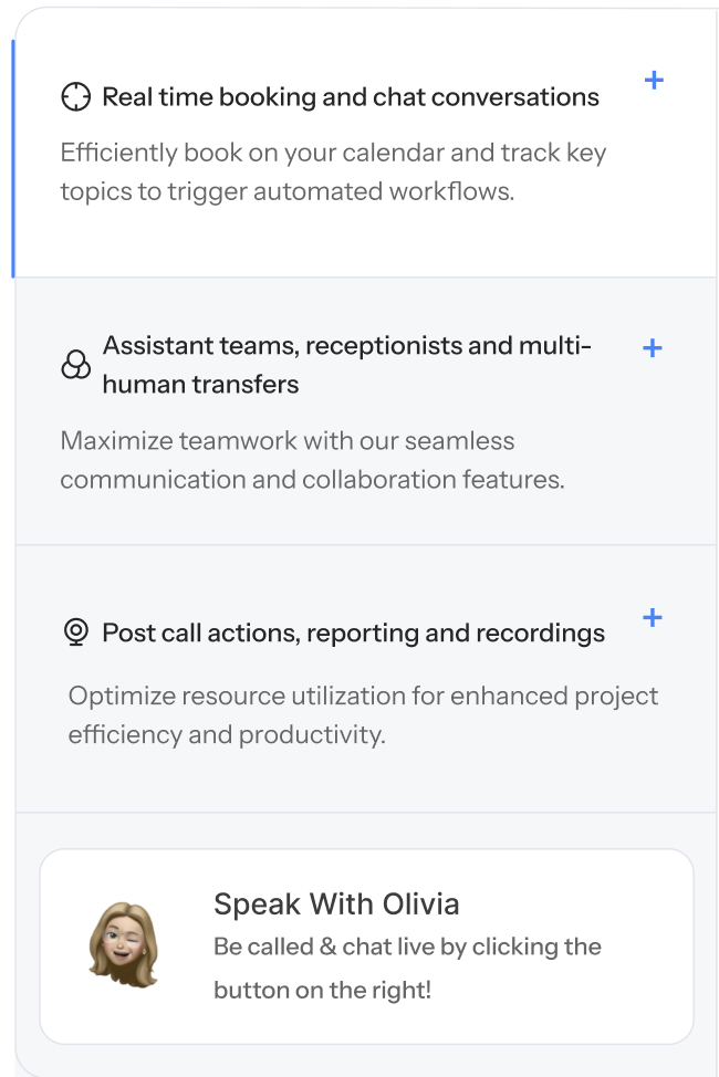 Want to chat live and be called by our A.I.? Speak with Olivia, just fill out the form and she’ll call you!
