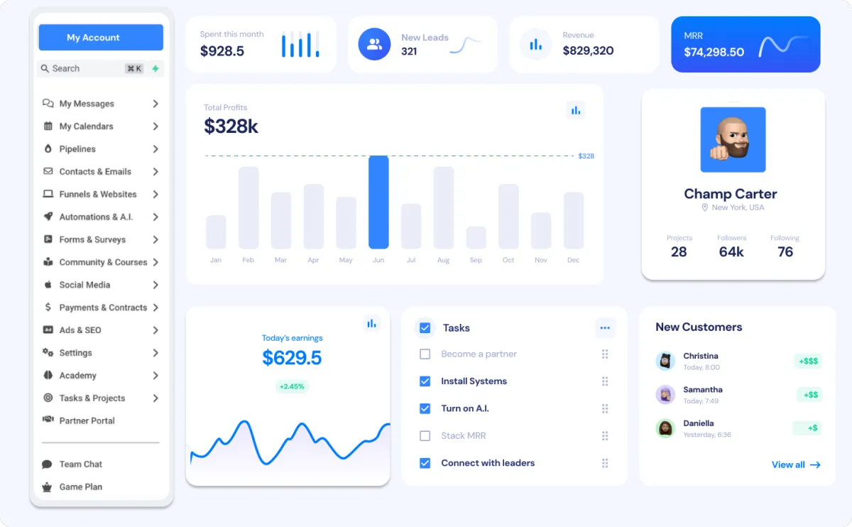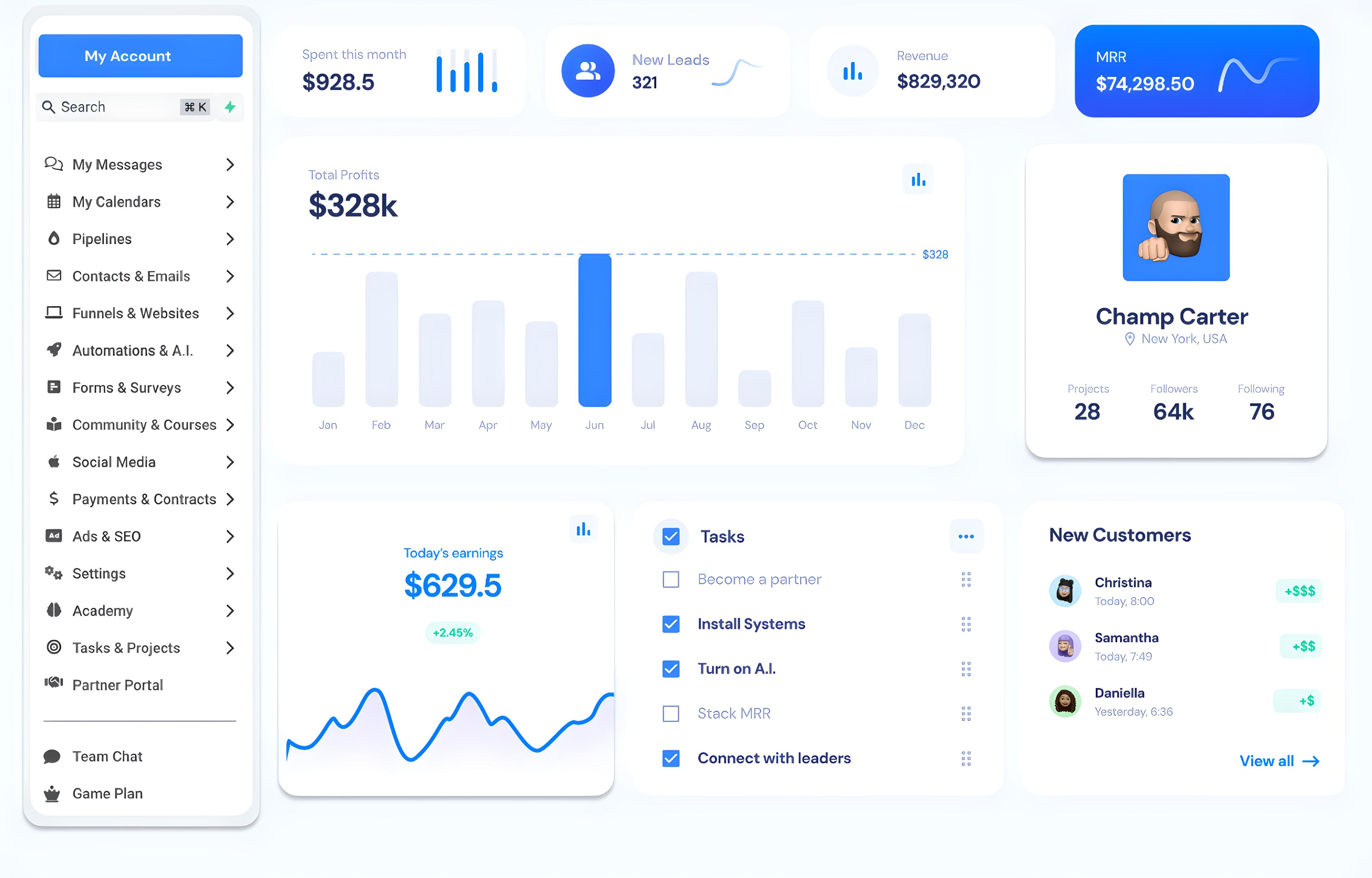 Generate leads, follow-up with proven campaigns, direct to the pre-built high-converting funnels, close the deal and onboard clients like crazy!